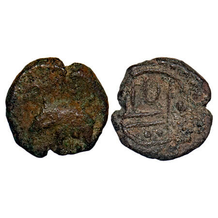 Chudasama dynasty of Gujarat, (12-13c AD), Copper Unit, 1.85gm, 11.98x12.23mm, Obv: Peacock standing facing to right side, Rev: Trident with traces of other symbols. Unpublished. Very Fine, Scarce.