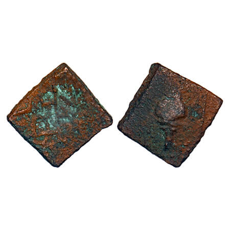 Chudasama dynasty of Gujarat, (12-13c AD), Copper Unit, 7.08x7.35 mm, Obv: Peacock standing facing to right side, Rev: Conch within circle and outer dotted border.About Very Fine, Scarce.