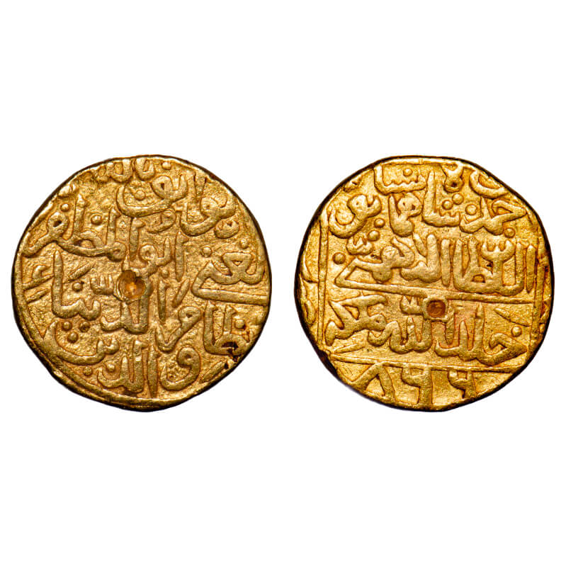 Bahmani Sultans of Gulbarga, Gold Tanka, 11.06g, Nizam al-Din Ahmad Shah III (1461-1463AD), Hadrat Muhammadabad Mint, AH 866, 11.06g. Obv: Arabic legend al-wathiq billah al-ghani abu'l muzaffar nizam al-duniya wa'l din. Rev: Within a rectangular border, Arabic legend ahmad shah bin humayun shah (sic!) al-sultan al-bahmani khallada allah mulkahu. G&G BH102 (listed as RRR). Very Fine, Very Rare.