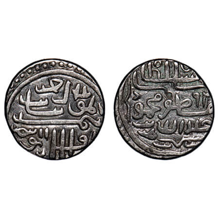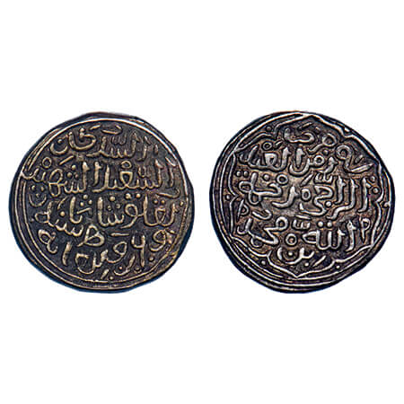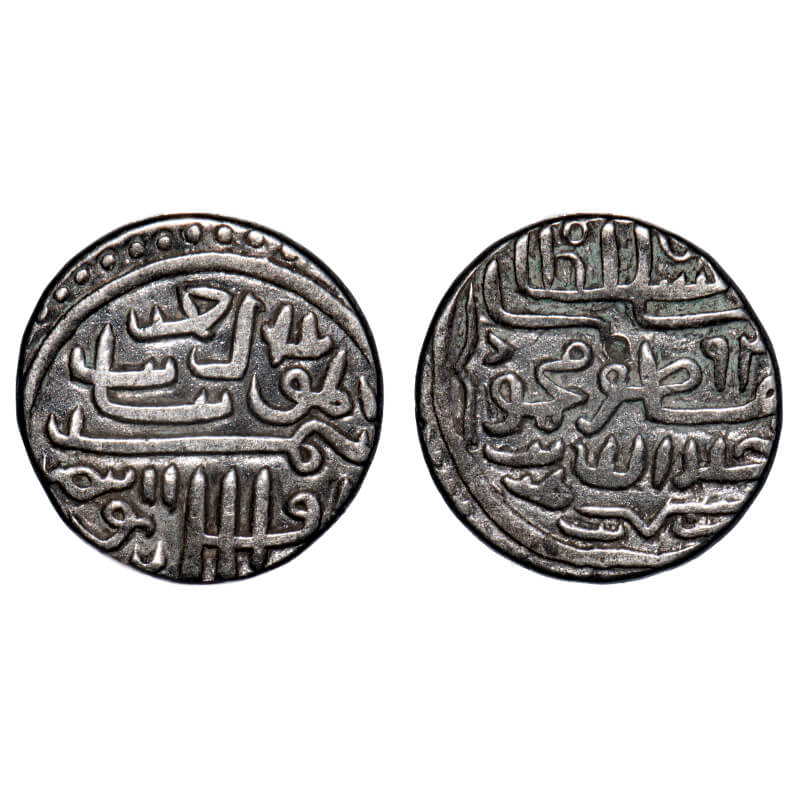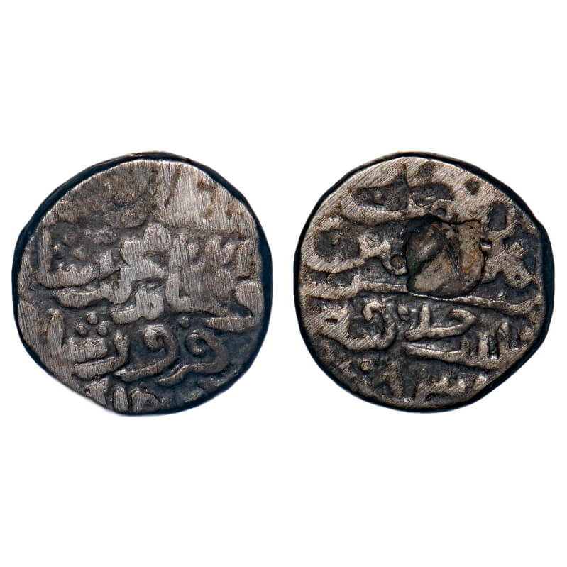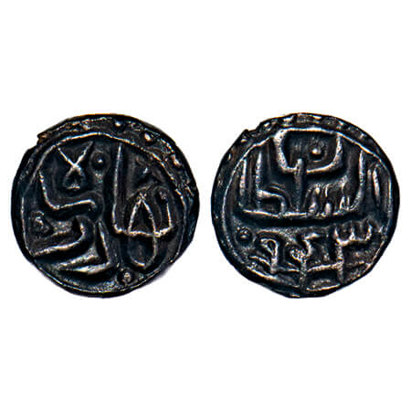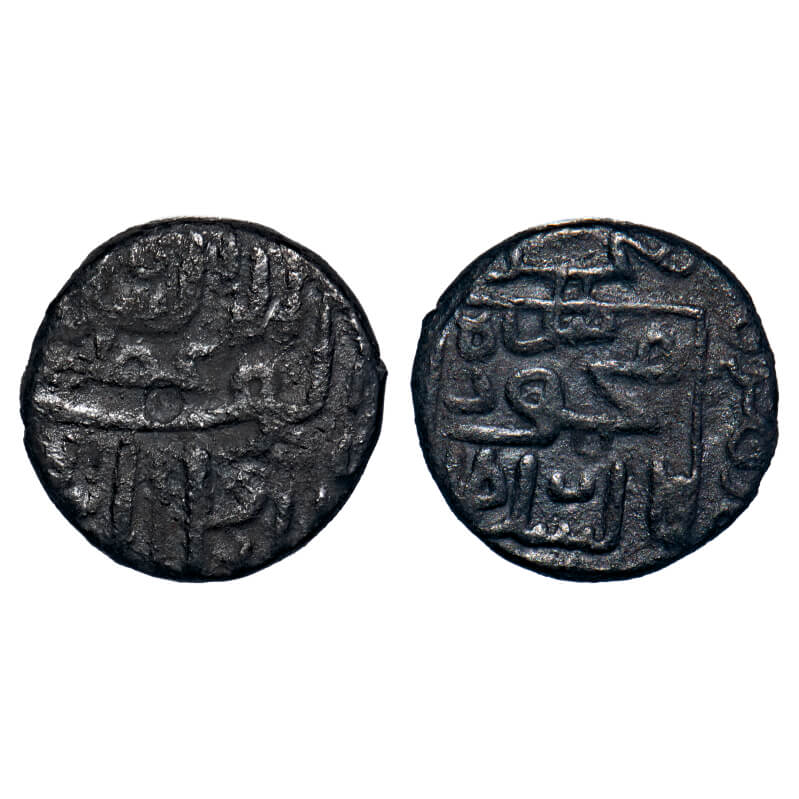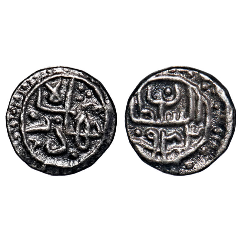 Gujarat Sultanate, Silver 1/6 Tanka, 1.11g, Qutb Al Din Bahadur (AH 932-943/1526-1537 AD), Mintless, AH 943, Obv: bahadur shah, Rev: al sultan sanah, legends within dotted circle on both sides. G&G G356. Toned Extremely Fine, Rare.