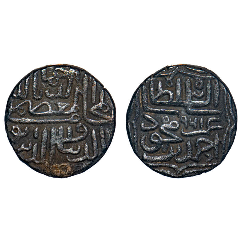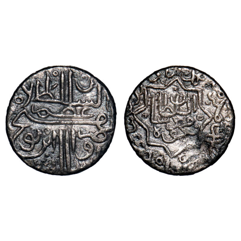 Gujarat Sultanate, Silver 1/6 Tanka, 1.18g, Qutb Al Din Bahadur Shah (AH 932-943/1526-1537 AH), Mintless, AH 941, Obv: bahadur Shah, Rev: al sultan sanah, legends withinin sixfoil on both sides. G&G G358. Extremely Very Fine, Rare.