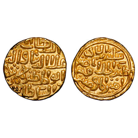 Bahmani Sultanate, Gold Tanka, 12.80g (heavy standard), Muhammad Shah I (AH 760-777 / 1359-1375 AD), AH 775, Ahsanabad Mint. Obv: sultan al ahd wal zaman hami milat rasul al rahman abul muzaffar muhammad shah bin bahman shah al sultan, Rev: muhammad hasan bahmani. G&G BH25. About Extremely Fine, Extremely Rare.