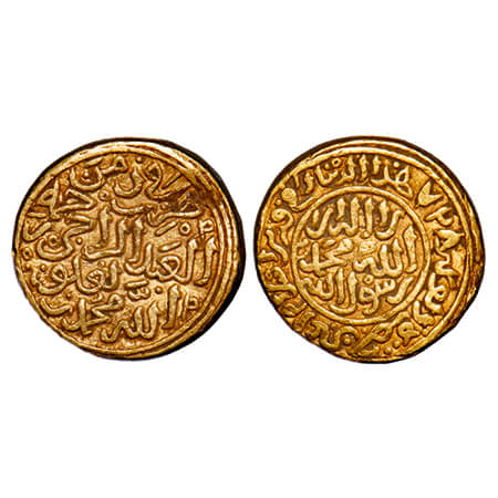Bahamani Sultanate, Gold Tanka, 11.03g, Ala Al Din Bahman Shah (AH 748-760, 1347-1359 AD), The founder of the Bahamani dynasty, (Hadrat Fathabad Mint), Obv: al sultan al azam ala al dunya wal din abul muzaffar bahman shah al sultan, Rev: sikandar al thani yamin al khilafa nasir al munin legend. G&G BH110. Extremely Fine, Extremely Rare.