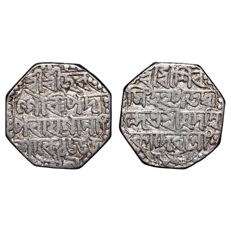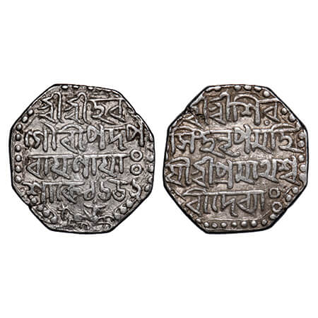 Assam, Octagonal Silver 1/16 Rupee, Gaurinatha Simha (1780-95), undated, Assamese legends in two lines, Obv: Sri Sri Gau/rinatha, Rev: Simha/ Nrpasya. Reverse die perfectly struck at 6 o'clock. (A.Mitra 432 types. RB. R128 types). NGC graded MS 64, Very Scarce.
