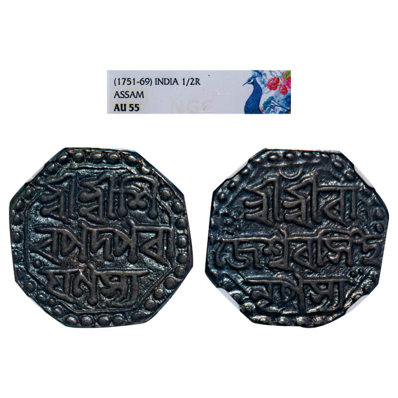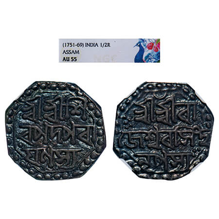 Assam, Octagonal Silver Half Rupee, Rajesvara Simha (Siu-rem-pha) (1751-1769), Assamese legends in three lines, undated, Obv: Sri Sri Si/va Pada Para/yanasya, (the only type with line at top of letter 'Si' in Siva extending right crossing border), Rev: Sri Sri Ra/jesvara Simha/ Nrpasya. Reverse die perfectly struck at 6 o'clock. (A.Mitra. 233 die variety, RB. O 55.1A without crescent Unlisted type). NGC graded AU 55, Very Scarce.