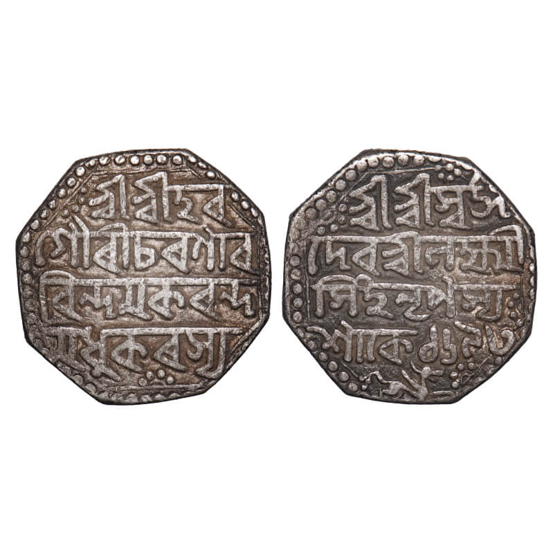 Assam, Octagonal Silver Rupee, 11.31g, Lakshmi Simha (1770-80), Sk. 1693, Assamese legends in four lines, with invocation to Siva and Parvati, Obv: Sri Sri Hara/ Gauri Charanara/vinda Makaranda/ Madhukarasya, Rev: Sri Sri Svarga/ Deva Sri Laksmi/ Simha Nrpasya / Sake 1693, lion running right, below. Reverse die perfectly struck at 6 o'clock. (A.Mitra. 285, RB. Q 26.4). Very Fine, Scarce.