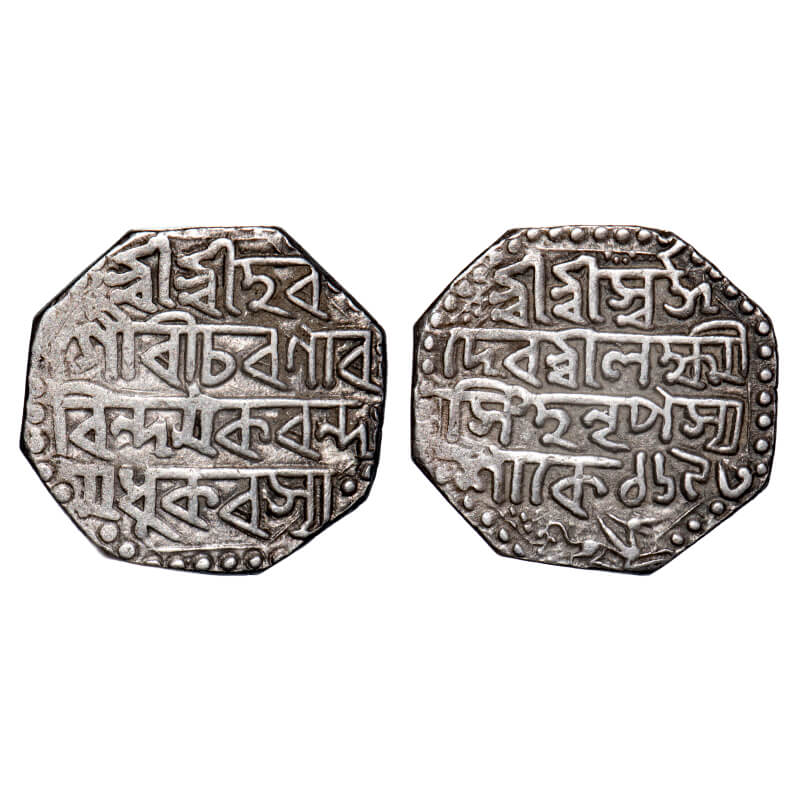 Assam, Octagonal Silver Rupee, 11.34g, Siva Simha citing Queen Pramathesvari, Sk. 1652, Obv: in four lines: Sri Sri Hara/ Gauri Pada Pa/rayanayah/ Sake 1652, lion with tail down at bottom running to right, Rev: in four lines: Sri Sri Siva/ Simha Nrpa Mahi/si Sri Pramathesva/ri Devyah. Reverse die perfectly struck at 6 o'clock. (A.Mitra. 92, RB. I 19.1). Very Fine, Very Scarce.