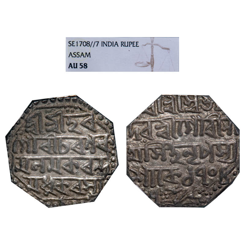 Assam, Octagonal Silver Rupee, Gaurinatha Simha (1780-95), Assamese legends in four lines, Sk. 1708 year 7, with invocation to Siva & Parvati, Obv: Sri Sri Hara/ Gauri Charana Ka/mala Makaranda/ Madhukarasya, Rev: Sri Sri Svarga/ Deva Sri Gaurina/tha Simha Nrpasya / Sake 1708/7, Winged lion at bottom running left. Reverse die perfectly struck at 6 o'clock. (A.Mitra. 355, RB. R 40.2). NGC graded AU 58, Scarce.