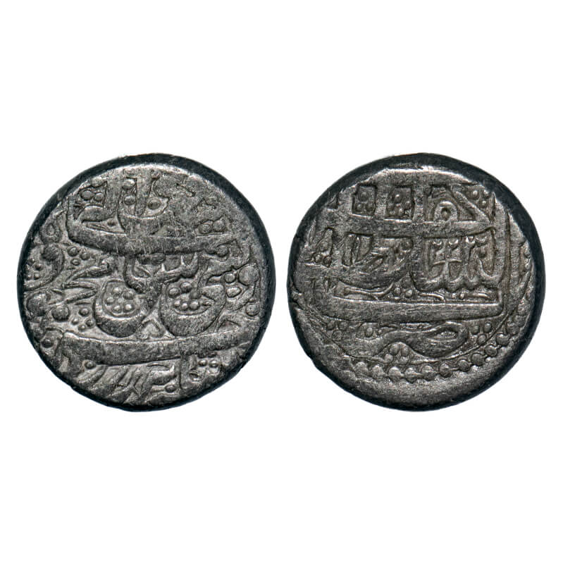 Durranis , Silver Rupee, 11.10g, Taimur Shah Durrani (AH 1186-1207 / 1772-1793 AD), AH 1193 / 6 RY, Kashmir Mint , Complete mint name, many decorative symbols on both sides , "Khursheed-wa-mah" couplet, Obv: Sikka e Taimur Shah Bar Chehre Naqsh Az Khursheed-wa-mah tarand me kharch aarad tilaa-o-nuqrah (The Heaven brings in Gold and Silver from the Sun and the Moon, so that it may receive the impression of the stamp of Taimur Shah) Rev: Sanah 6 Jalus Maimanat Manus Zarb Kashmir [Struck at Kashmir in the Sixth Year of his Reign Associated With Prosperity, No test mark. Note - The coins of first few years of Taimur shah Kashmir relatively difficult to find. KM 563, About Extremely Fine, Scarce.