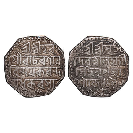 Assam, Octagonal Silver Rupee, 11.34g, Lakshmi Simha (1770-80), Sk. 1693, Assamese legends in four lines, with invocation to Siva and Parvati, Obv: Sri Sri Hara/ Gauri Charanara/vinda Makaranda/ Madhukarasya, Rev: Sri Sri Svarga/ Deva Sri Laksmi/ Simha Nrpasya / Sake 1693, lion running right, below. Reverse die perfectly struck at 6 o'clock. (A.Mitra. 285, RB. Q 26.4 Type unlisted die variety). Very Fine, Scarce.