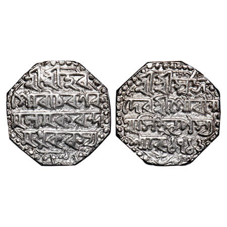 Assam, Octagonal Silver 1/16 Rupee, Gaurinatha Simha (1780-95), undated, Assamese legends in two lines, Obv: Sri Gau/rinatha, Rev: Simha/ Nrpasya, (A.Mitra 433 types. RB. R128.1 types). NGC graded MS 61, Very Scarce.