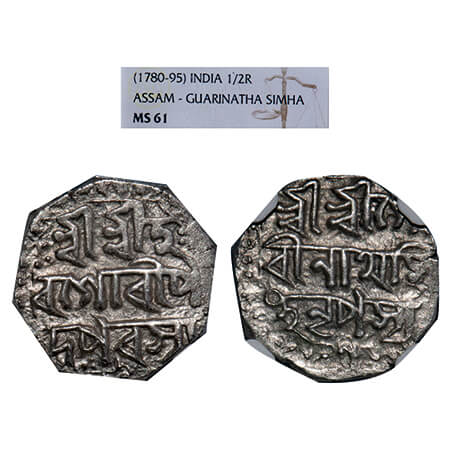 Assam, Octagonal Silver Half Rupee, Gaurinatha Simha (1780-95), Assamese legends in three lines, undated, with invocation to Siva & Parvati, Obv: Sri Sri Ha/ra Gauri Pa/da Parasya, Rev: Sri Sri Gau/rinatha Si/mha Nrpasya. Reverse die perfectly struck at 6 o'clock. (A.Mitra. 378A type, RB. R 67.2 type). NGC graded MS 61, Scarce.