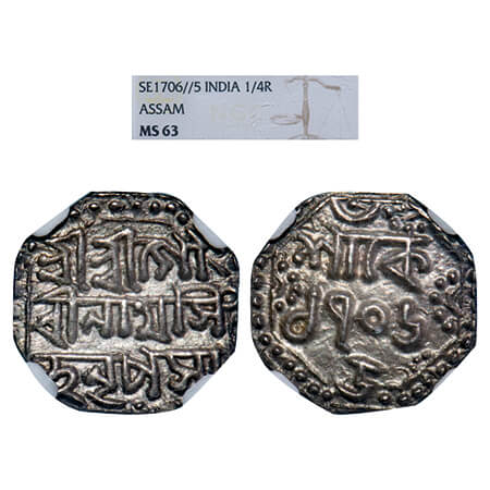 Assam, Octagonal Silver Quarter Rupee, Gaurinatha Simha (1780-95), Sk. 1706 year 5, Assamese legends in three lines, Obv: Sri Sri Gau/rinatha Sim/ha Nrpasya, Rev: in two lines, Sake 1706 / 5, crescent on top left, Reverse die perfectly struck at 6 o'clock. (A.Mitra. 403A. RB. R95.1). NGC graded MS 63, Rare.