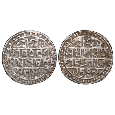 Assam, Octagonal/circular Silver 1/32 Rupee, Gaurinatha Simha (1780-95), undated, Assamese legends in two lines, Obv: Sri Gau, Rev: rina/ thasya (3). Reverse die perfectly struck at 6 o'clock. (A.Mitra 435 types. RB. R132 types). NGC graded AU 58, Very Scarce.