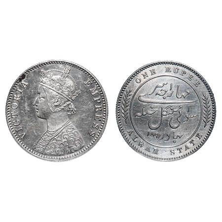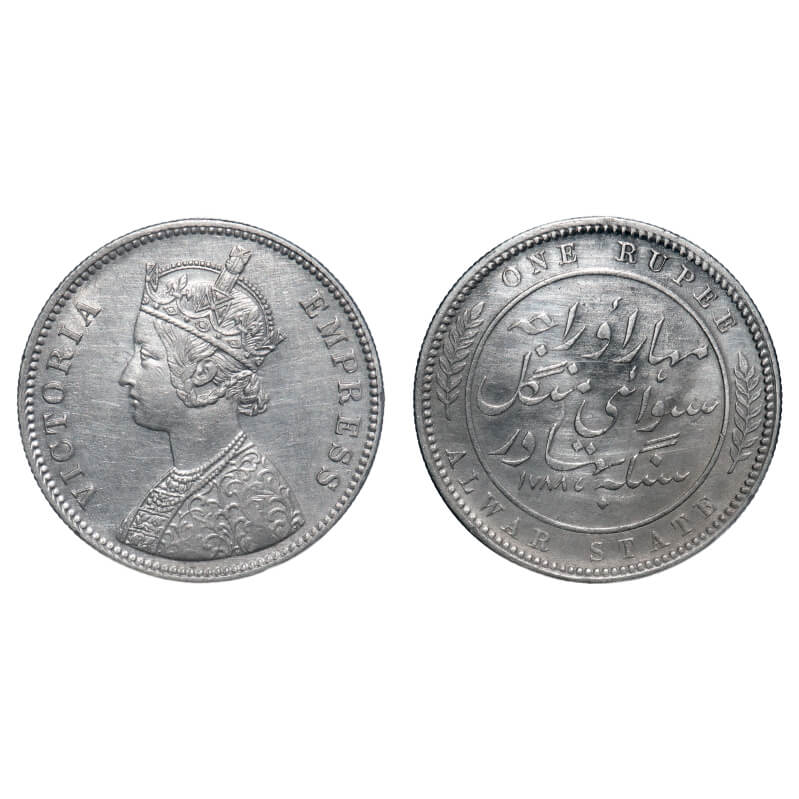 Alwar, Silver Rupee, 11.65g, Mangal Singh, AD 1891, Calcutta Mint, Portrait of Victoria Empress type C3, branch with twig. Milled coinage. KM 46. About Uncirculated details, Rare.