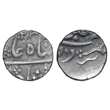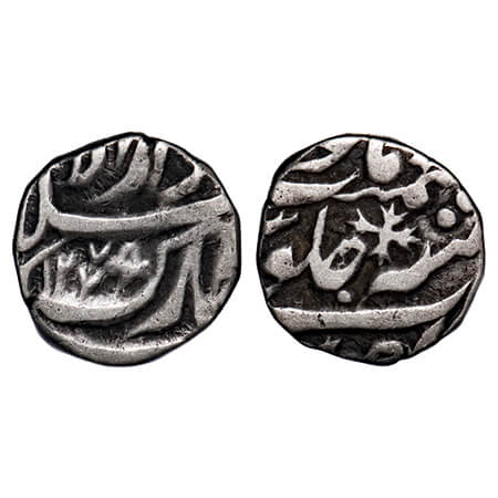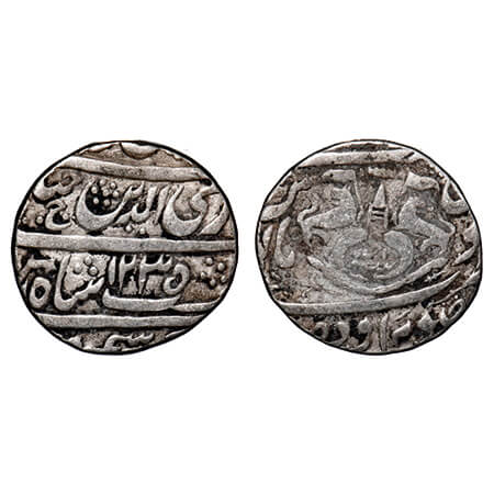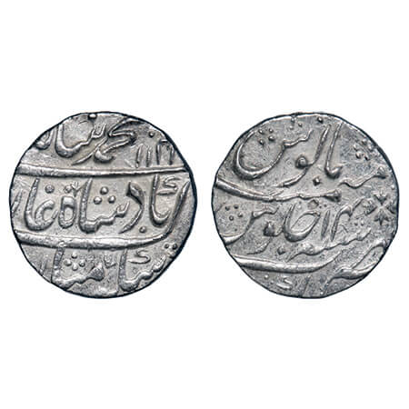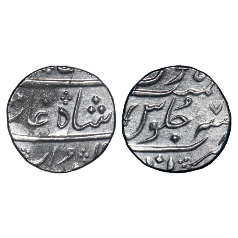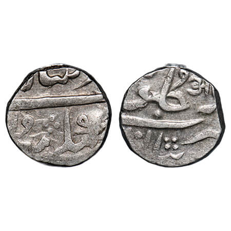 Baroda, Silver Rupee, 11.39g, (early Issue) Prior issue to Anand Rao (AH 1215-1235/1800-1819 AD), Baroda Mint, INO Shah Alam II, 7 RY, Rev: Sword as mint mark. KM Unlisted. Very Fine+, Rare.