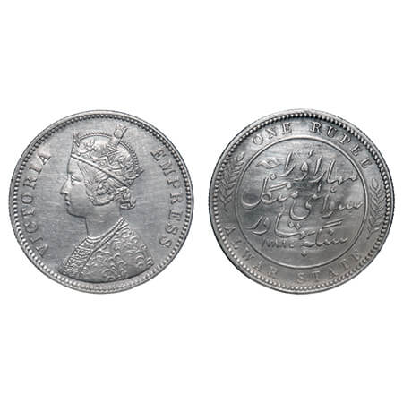 Alwar, Silver Rupee, 11.60g, Mangal Singh (AH 1291-1318/ 1874-1892 AD), Calcutta Mint, AD 1788 Error date, Portrait of Victoria Empress, Milled coinage. KM 45. About Extremely Fine, Very Scarce.
