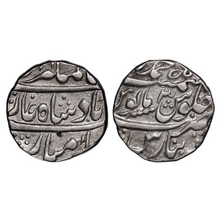 Awadh, Silver Rupee, 11.28g, Shuja ud Daula (AH 1167-1188 / 1754-1775 AD), Muhammadabad Banaras Mint, 3 RY, INO Alamgir II, 'Meem' joined to 'gaaf ' of alamgir type. MKDM 3.18 type, unlisted date for the type. Extremely Fine, Very Scarce.