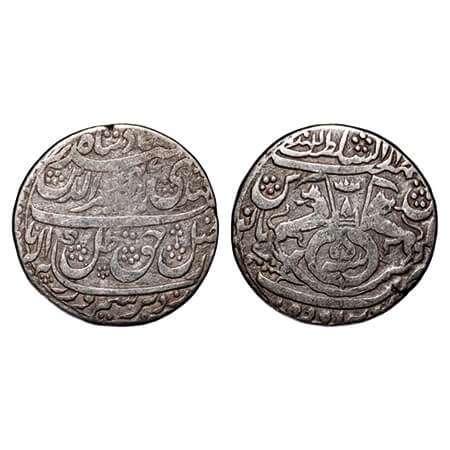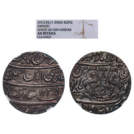 Awadh, Silver Rupee, Ghazi-ud-din Haidar as Nawab, Mint variety II, Dar us Ameerat Suba Awadh, AH 1235/Ahad (1) RY. MKDM 7.22 type. NGC graded AU details cleaned, Scarce.