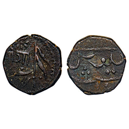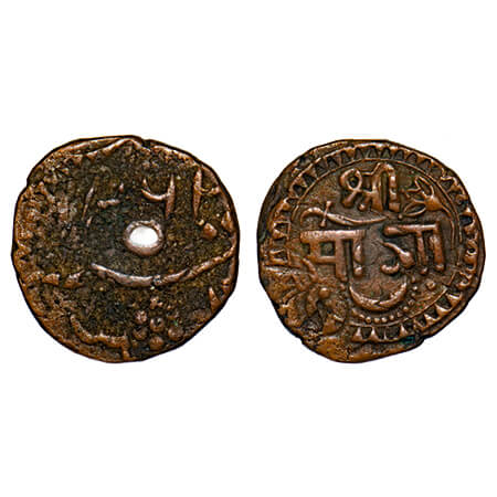 Baroda, Copper Paisa, 6.60g, Sayaji Rao II (AH 1235-1264/1819-1847 AD), Amreli Mint, nagari 'Sa Ga', between nagari 'Shri' above and crescent in beaded dots below, with lotus/trident on reverse. Centre struck. KM C 29.8. Very Fine, Rare.