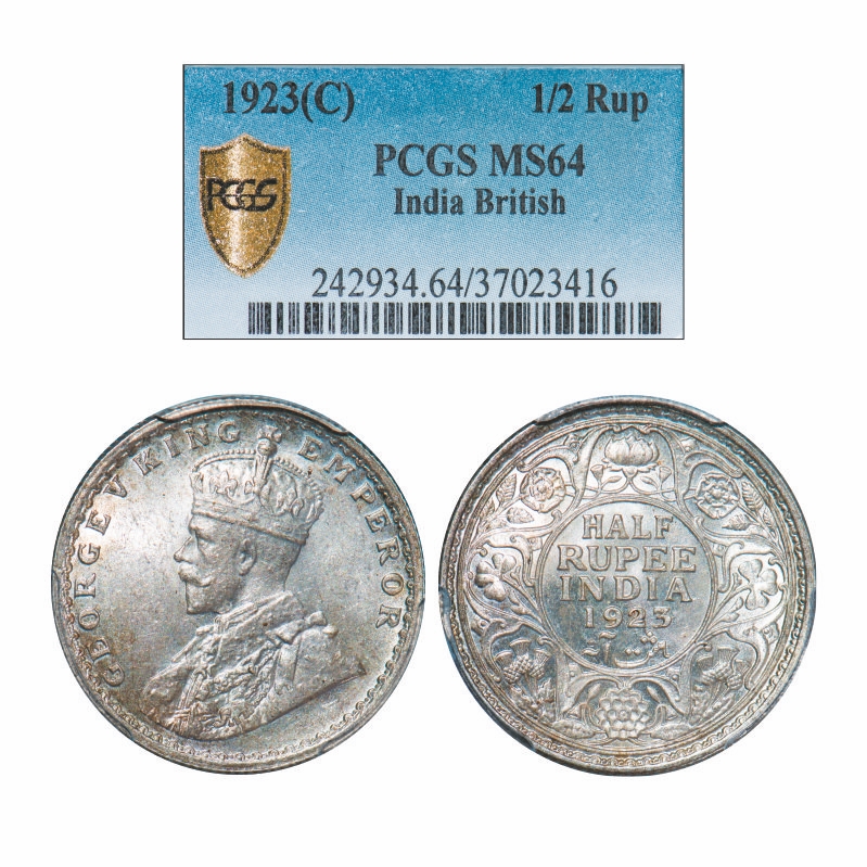 George V, Silver, Half Rupee, 1923, Calcutta Mint, No dot. GK 1061. PCGS Slabbed MS 64. Very Rare.