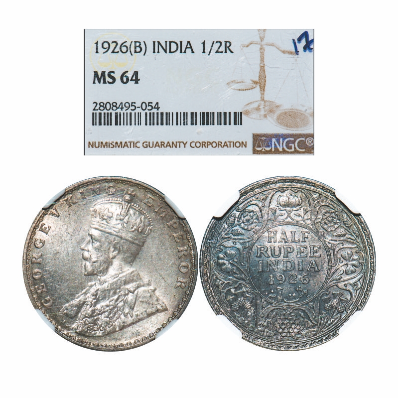George V, Silver, Half Rupee, 1926, Bombay Mint, Dot. GK 1068. NGC Slabbed MS 64. Very Rare.