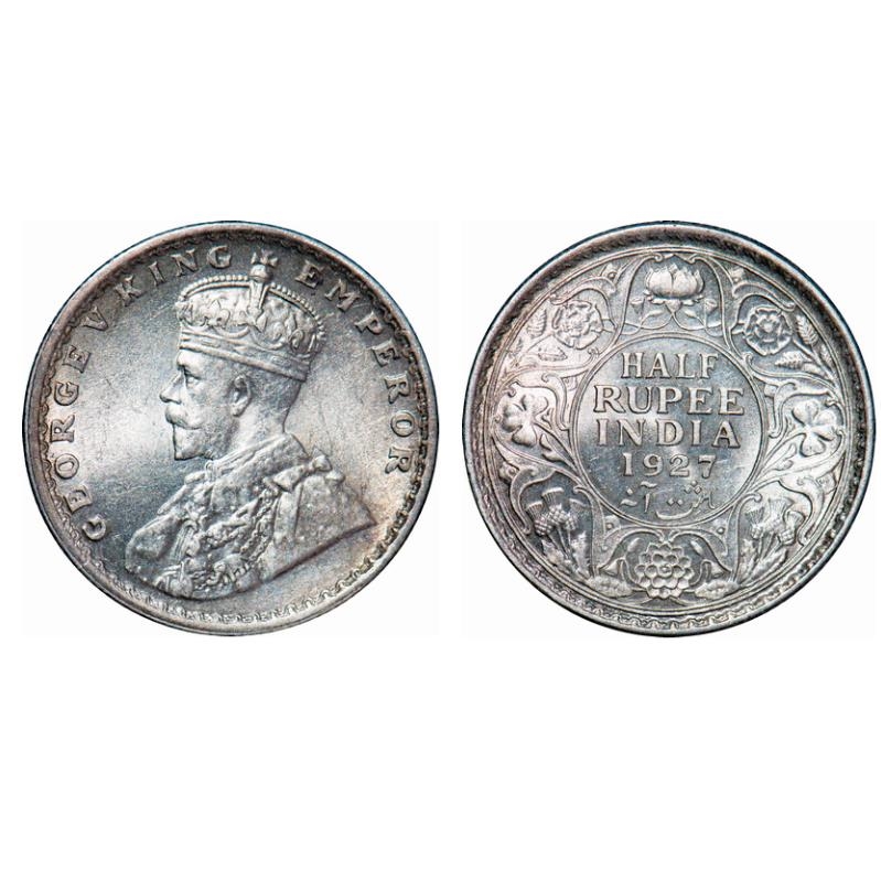 George V, Silver, Half Rupee, 1927, Calcutta mint, No dot. GK 1069. Brilliant Uncirculated. Rare.