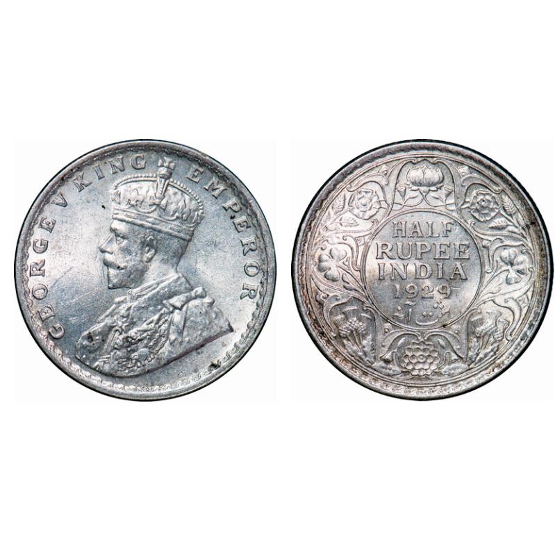 George V, Silver, Half Rupee, 1929, Calcutta Mint, No dot. GK 1071. Uncirculated. Rare.