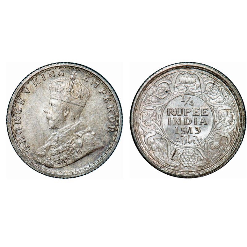 George V, Silver, 1/4 Rupee, 1913, Calcutta Mint, No dot. GK 1083. Uncirculated. Very Scarce.