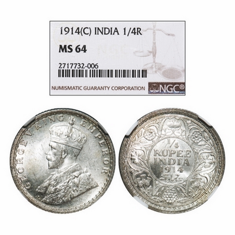 George V, Silver, 1/4 Rupee, 1914, Calcutta Mint, No dot. GK 1085. NGC Slabbed MS 64. Rare.