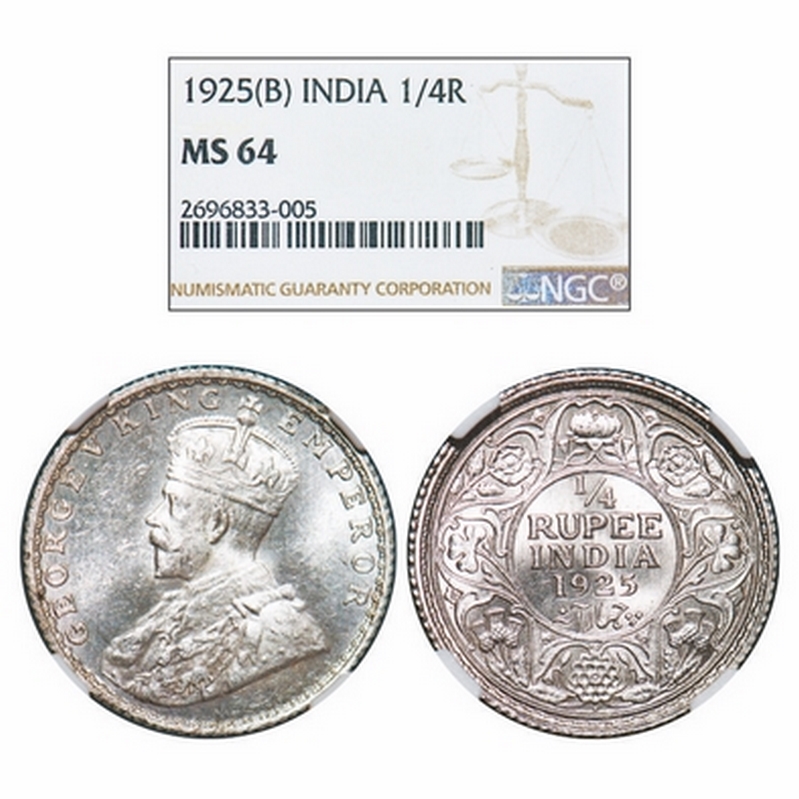 George V, Silver, 1/4 Rupee, 1925, Bombay Mint, Dot. GK 1093. NGC Slabbed MS 64. Very Scarce.