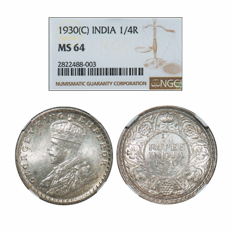 George V, Silver, 1/4 Rupee, 1930, Calcutta Mint, No dot. GK 1097. NGC Slabbed MS 64. Rare.