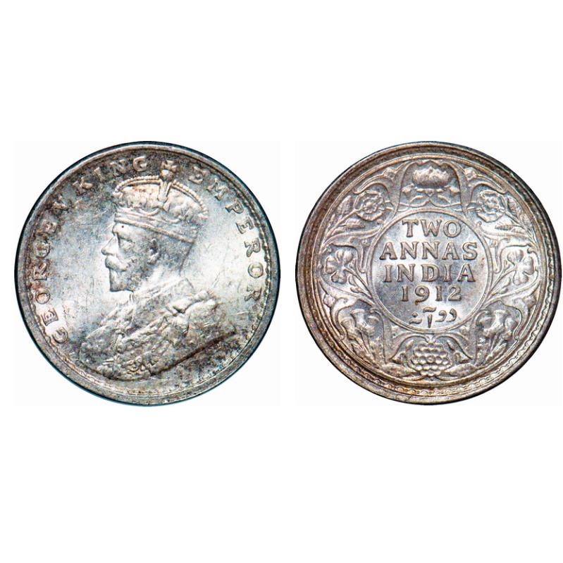 George V, Silver, 2 Annas, 1912, Bombay Mint, Dot, Ghost on Rev. GK 1109. Brilliant Uncirculated. Very Scarce.