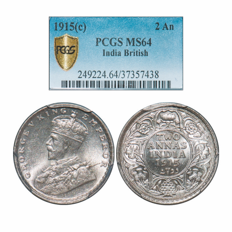 George V, Silver, 2 Annas, 1915, Calcutta Mint, No dot. GK 1114. PCGS Slabbed MS 64. Rare.