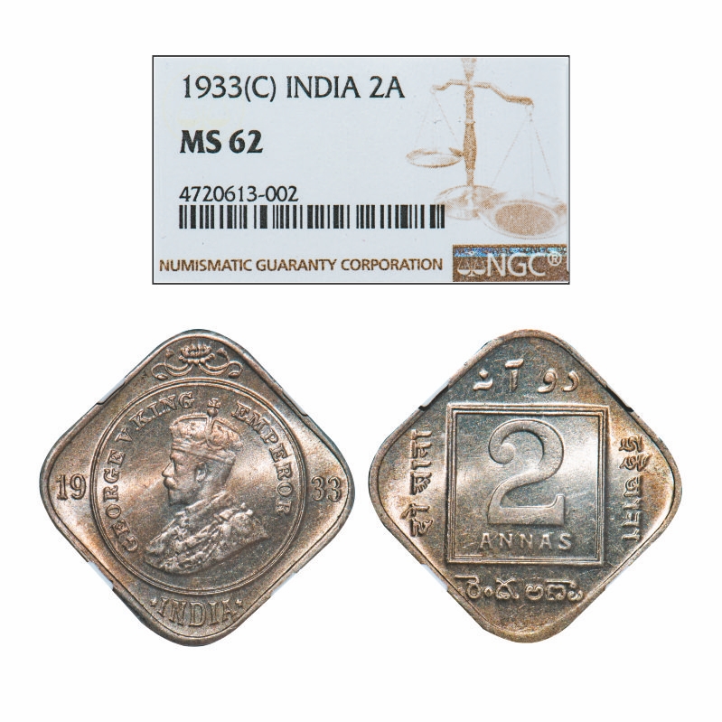 George V, Copper-Nickel, 2 Annas, 1933, Calcutta Mint, No dot. GK 1136. NGC Slabbed MS 62. Very Rare.