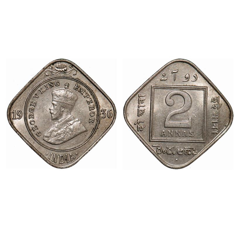 George V, Copper-Nickel, 2 Annas, 1936, Bombay Mint, Dot, Tiny diamond shape pyramis seen on Obv and Rev. GK 1140. Almost Uncirculated. Very Scarce.