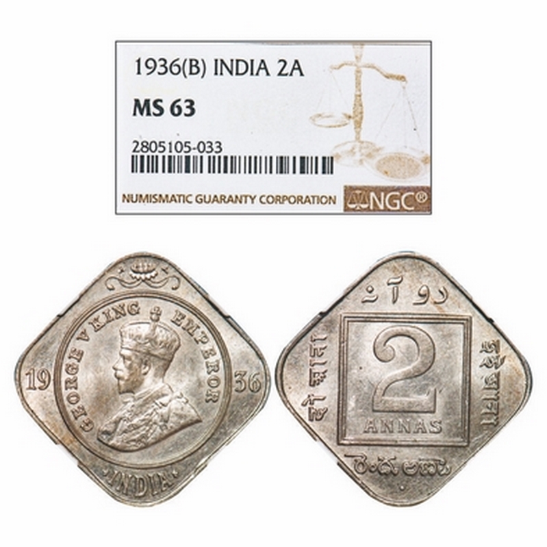 George V, Copper-Nickel, 2 Annas, 1936, Bombay Mint, Dot. GK 1140. NGC Slabbed MS 63. Very Scarce.