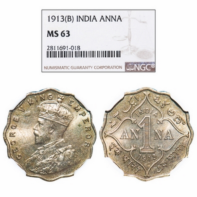 George V, Copper-Nickel, 1 Anna, 1913, Bombay Mint, No dot. GK 1143. NGC Slabbed MS 63. Rare.