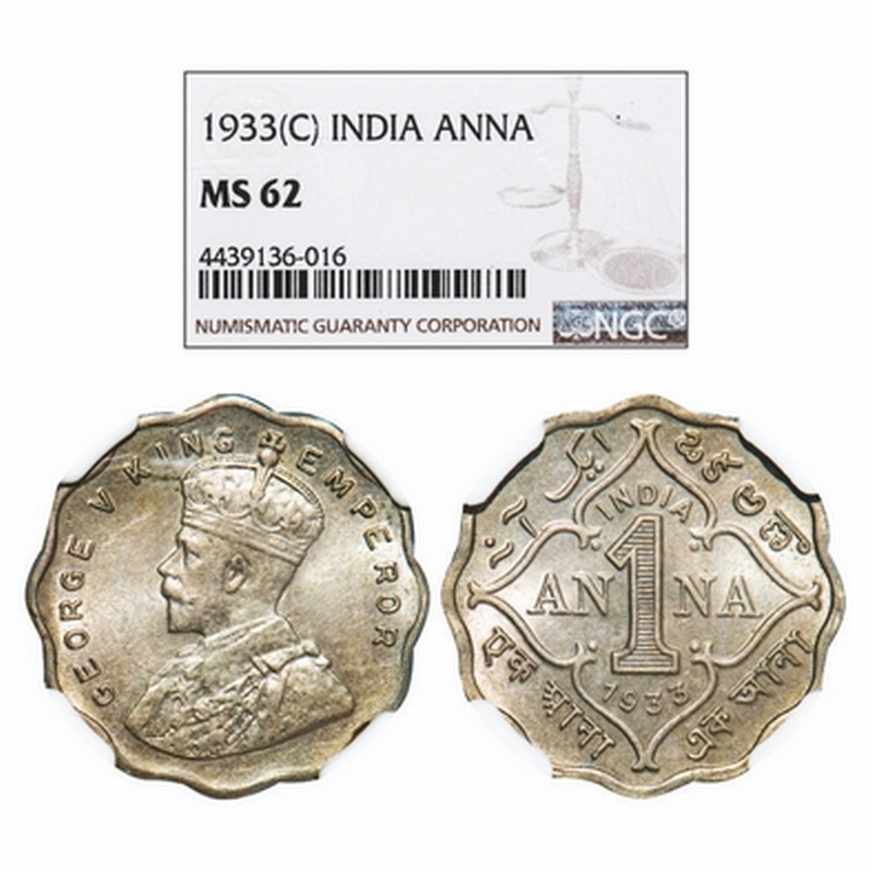 George V, Copper-Nickel, 1 Anna, 1933, Calcutta Mint, No dot. GK 1164. NGC Slabbbed MS 62. Extremely Rare.