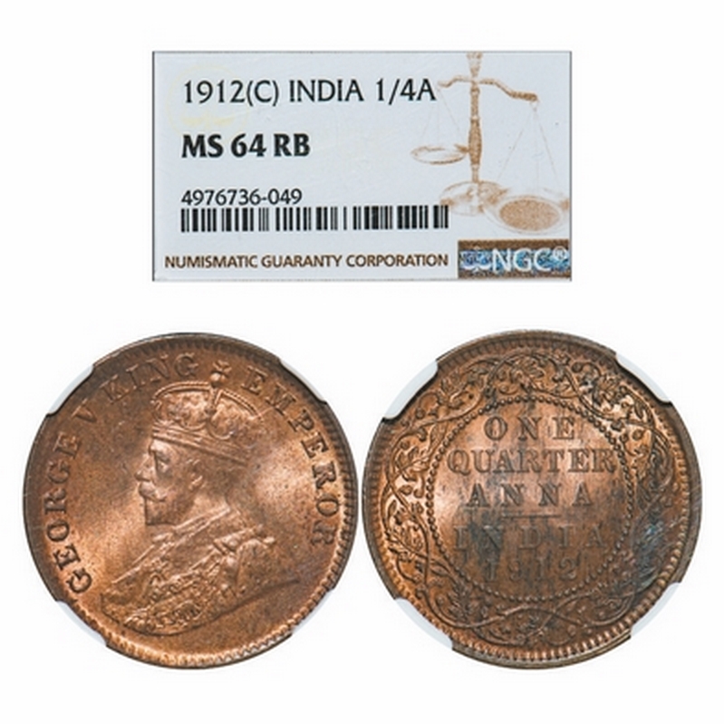 George V, Bronze, Quarter Anna, 1912, Calcutta Mint, No mint mark. GK 1172. NGC Slabbed MS 64 RB. Rare.