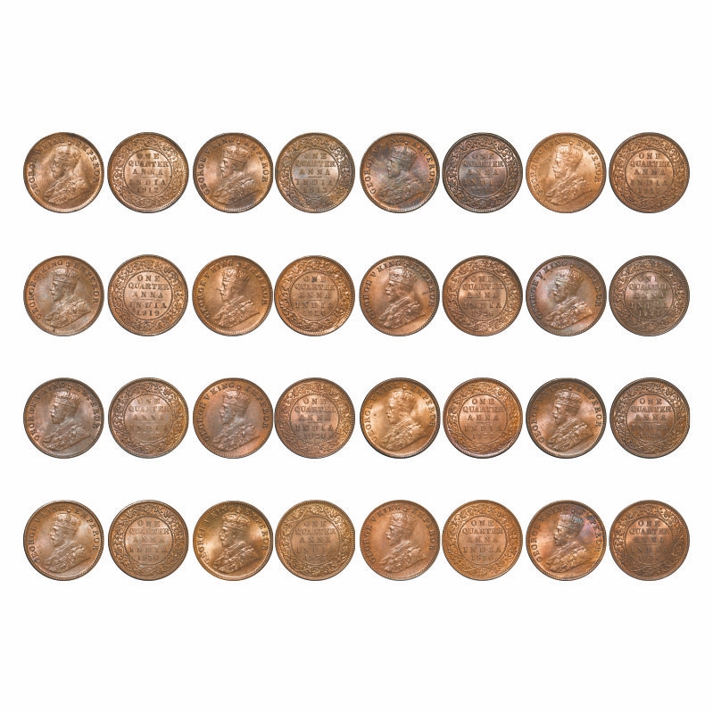George V, Bronze, Quarter Anna, (Lot of 16 coins), 1) 1912, Calcutta Mint, No dot, 2) 1913,Calcutta Mint, No dot, 3) 1914, Calcutta Mint, No dot, 4) 1918, Calcutta Mint, No dot, 5) 1919, Calcutta Mint, No dot, 6) 1920, Calcutta Mint, No dot, 6) 1926, Bombay Mint, Dot, 8) 1927, Bombay Mint, Dot, 9) 1927, Calcutta Mint, No dot, 10) 1928, Bombay Mint, Dot, 11) 1928, Calcutta Mint, No dot, 12) 1929, Calcutta Mint, No dot, 13) 1930, Calcutta mInt, no dot, 14) 1935, Calcutta Mint, No dot, 15) 1936, Bombay Mint, Dot, 16) 1936, Calcutta Mint, No dot. GK 1172, 1173, 1174, 1177, 1178, 1179, 1183, 1185, 1186, 1187, 1188, 1189, 1191, 1195, 1196, 1197. Brilliant Uncirculated. Very scarce as a lot. |
