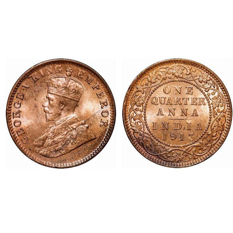 George V, Bronze, Quarter Anna, 1913, Calcutta mint, No dot, Ghost on Rev. GK 1173. Brilliant Uncirculated. Very Scare.