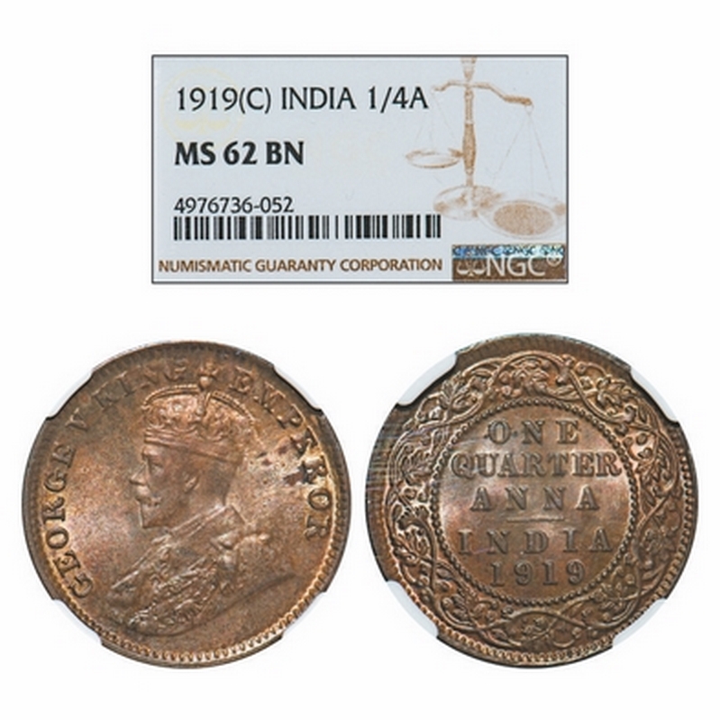 George V, Bronze, Quarter Anna, 1919, Calcutta Mint, No dot. GK 1178. NGC Slabbed MS 62 BN. Scarce.