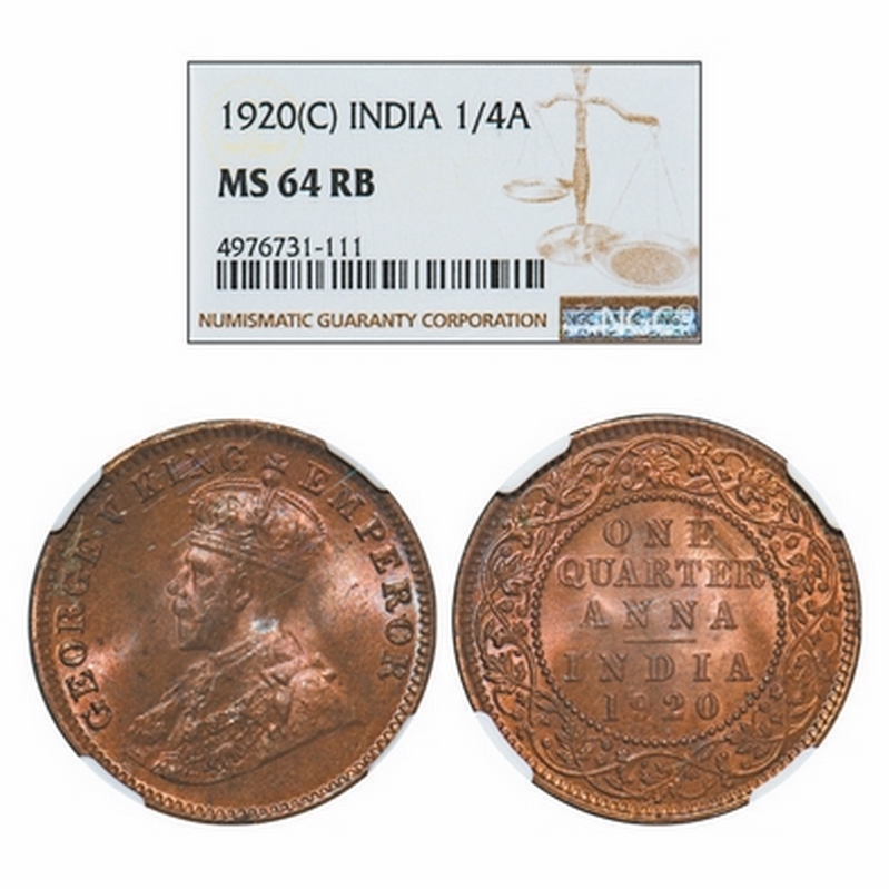 George V, Bronze, Quarter Anna, 1920, Calcutta Mint, No dot. GK 1179. NGC Slabbed MS 64 RB. Very Scarce.
