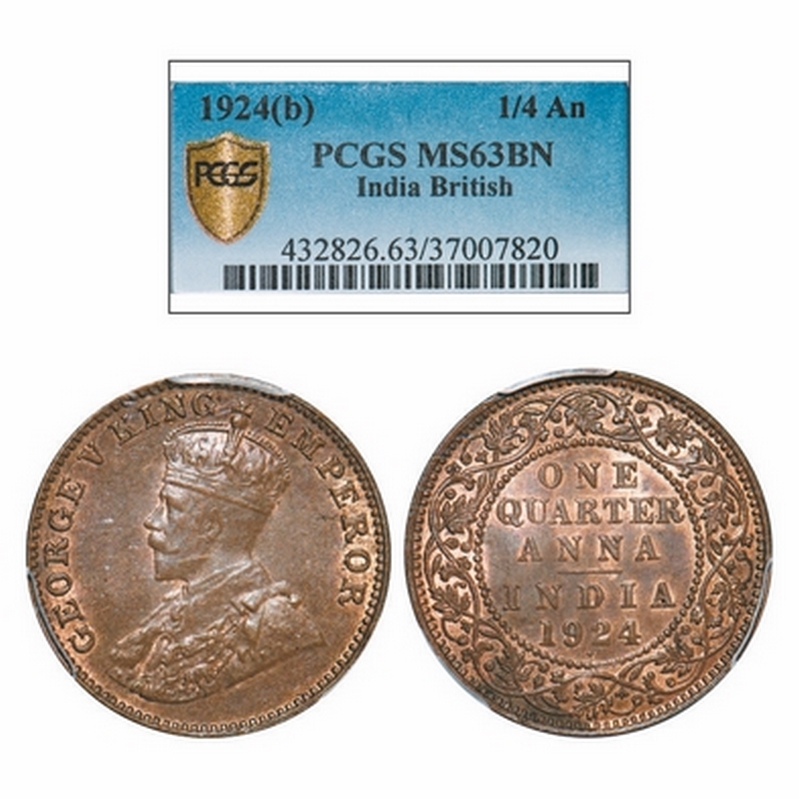 George V, Bronze, Quarter Anna, 1924, Bombay Mint, Dot. GK 1180. PCGS Slabbed MS 63 BN. Very Scarce.