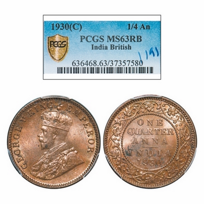 George V, Bronze, Quarter Anna, 1930, Calcutta Mint, Dot. GK 1180. PCGS Slabbed MS 63 RB. Very Scarce.