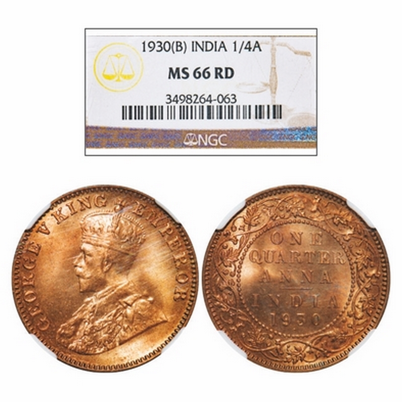 George V, Bronze, Quarter Anna, 1930, Bombay Mint, Dot, Variety: small year numerals with more space in between. GK Unlisted. NGC Slabbed MS 66 RD. Rare.