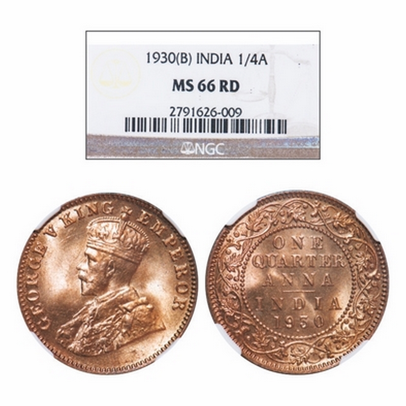 George V, Bronze, Quarter Anna, 1930, Bombay Mint, Dot, Variety: small year numerals with more space in between. GK Unlisted. NGC Slabbed MS 66 RD. Rare.
