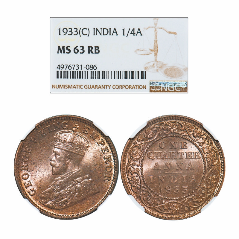 George V, Bronze, Quarter Anna, 1933, Calcutta Mint, No dot. GK 1193. NGC Slabbed MS 63 RB. Very Scarce.