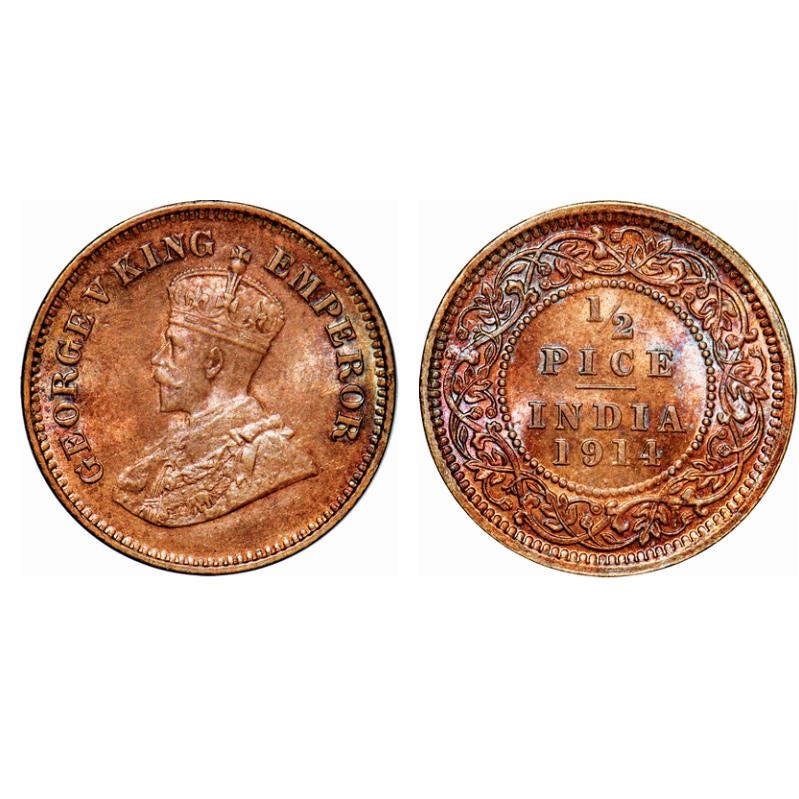 George V, Bronze, 1/2 Pice, 1914, Calcutta Mint, No mint mark. GK 1200. Brilliant Uncirculated, Rainbow Toned. Very Scarce.